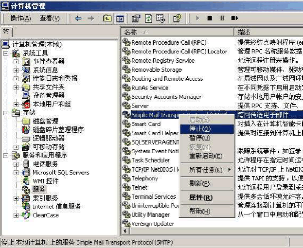 因為我們要使用 Domino 系統(tǒng)的 SMTP 服務,所以如果你的試驗機器為 Windows 2000 Server 操作系統(tǒng)的話,可能會有處于啟動狀態(tài)的 SMTP 服務,所以要停止該服務。停止方法,用鼠標右鍵點擊 " 我的電腦" ,在出現(xiàn)的菜單中選擇" 管理" ,然后如下圖: