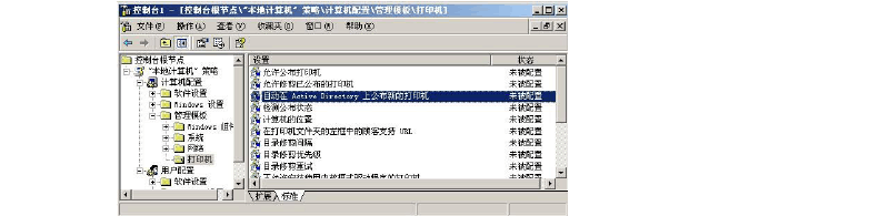 展開“本地計算機策略”樹,在“計算機配置”—“管理模板”—“打印機”的右邊屬性窗口中,禁用“自動在Active Directory上發(fā)布新的打印機”屬性,則禁用打印機自動發(fā)布。