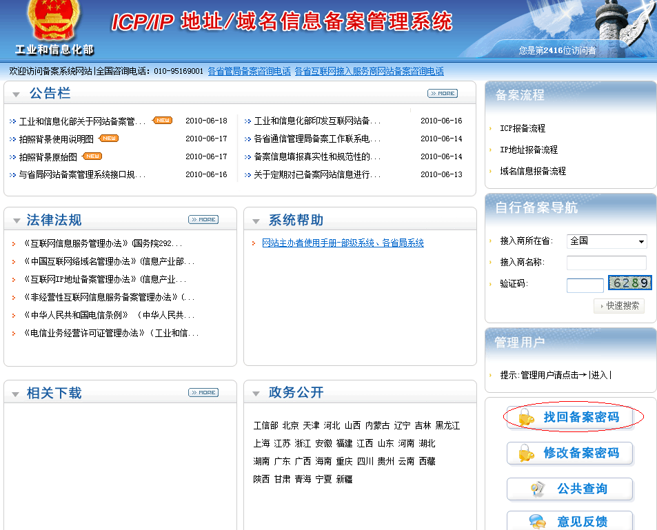 (1)網(wǎng)站主辦者登陸主體所在省的通信管理局系統(tǒng)或者登陸部級系統(tǒng)鏈接到省局系統(tǒng)(部、省公共信息服務(wù)系統(tǒng)鏈接地址詳見下表1),點擊“找回備案密碼”,可進(jìn)行備案密碼的重置。