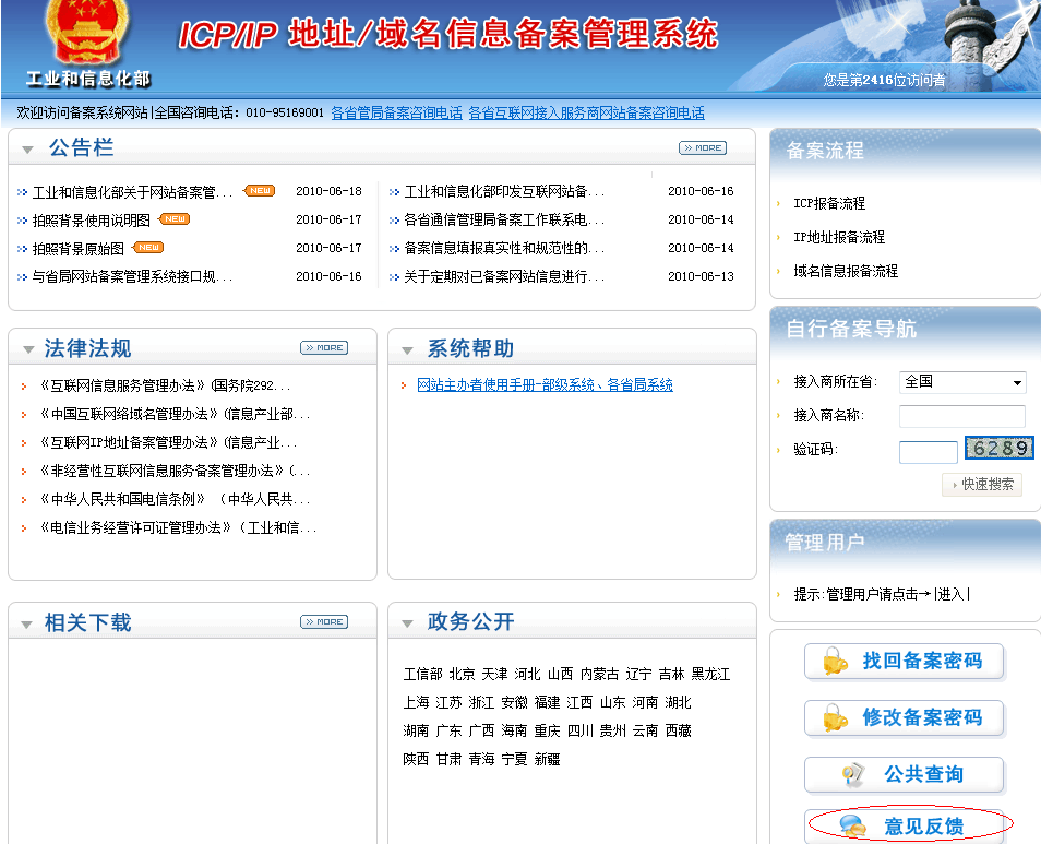 網(wǎng)站主辦者登陸主體所在省的通信管理局系統(tǒng)(部、省公共信息服務(wù)系統(tǒng)鏈接地址詳見下表1),點擊“意見反饋”,可將意見反饋到當(dāng)?shù)赝ㄐ殴芾砭帧?/p>
