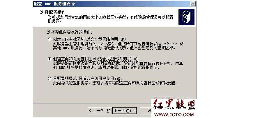 3 選擇【創(chuàng)建正向和反向查找區(qū)域(適合大型網(wǎng)絡(luò)使用)】-----【下一步】
