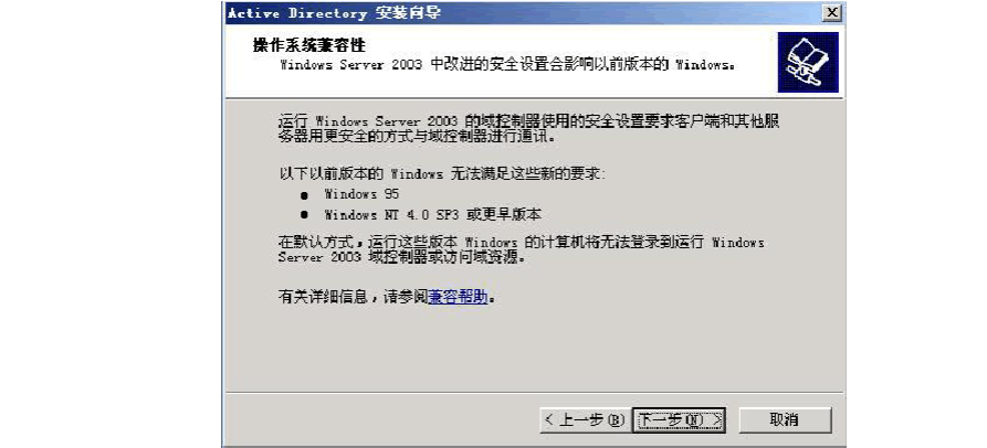 這里是一個兼容性的要求,Windows 95及NT 4 SP3以前的版本無法登陸運行到Windows Server 2003的域控制器,我建議大家盡量采用Windows 2000及以上的操作系統(tǒng)來做為客戶端。然后點擊“下一步”,