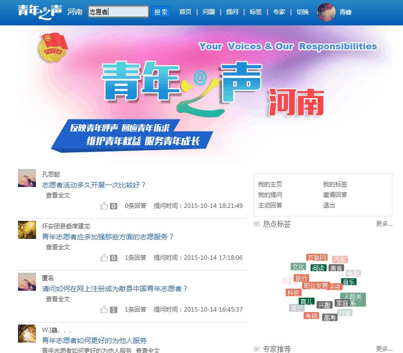 ,青年之聲微邦組織內(nèi)主管、協(xié)管、大V 登錄成功后,默認顯示青年之聲全省信息聚合頁面,比普通用戶增加問題統(tǒng)計功能。
