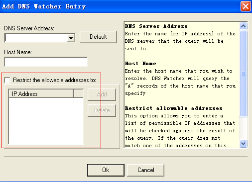 DNS Watcher的"restrict the allowable addresses"選項,可以用于偵測網(wǎng)址嫁接攻擊: