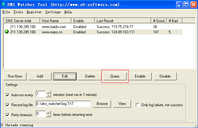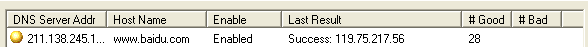 a) 、在域名自動撥測失敗時,在確認(rèn)網(wǎng)絡(luò)正常的情況下,請使用Query 工具,手工執(zhí)行該域名的撥測,確認(rèn)是否能夠成功返回域名對應(yīng)的A 記錄。如果能夠撥測成功,說明域名服務(wù)器無異常,如果多次查詢失敗,請聯(lián)系DNS 管理員。