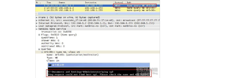 可以看到,在圖形界面下僅僅提示找不到XP3這個主機,而從抓包的情況來分析更明顯些,我們可以很清楚的看到當(dāng)提交此請求后,系統(tǒng)會向已配置的DNS 服務(wù)器(DHCP