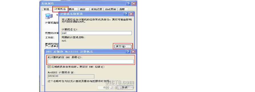 上圖已經(jīng)將兩者的關(guān)系表述清楚了,XP2現(xiàn)在還是一臺普通的客戶端,為加入域。 我們打開XP2的屬性,在里面找一下它的DNS 后綴,如下圖: