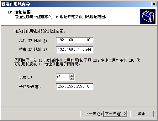 根據(jù)網(wǎng)絡(luò)的規(guī)模規(guī)劃IP 地址。此例中設(shè)定為“192.168.1.10~192.168.1.244”,則需要在“起始IP 地址”項填寫 “192.168.1.10”,“結(jié)束IP 地址”項填寫“192.168.1.244”,子網(wǎng)掩碼為“255.255.255.0”,如圖2所示。