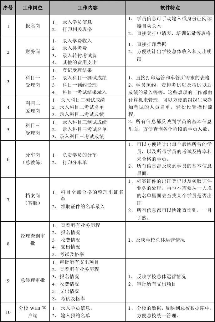 財(cái)務(wù)收入支出情況,方便統(tǒng)計(jì)出有哪些學(xué)員欠費(fèi),或需要交補(bǔ)考費(fèi)等。車(chē)輛的油耗,維修登記,方便查出每輛車(chē)的油耗,維修費(fèi)用情況。