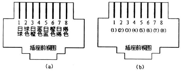 制作交叉雙絞線(一端按EIA/TIA 568A線序,另一端按EIAFFIA 568B線序) 時(shí),其中一端的線序如圖1-2(a)所示,另一端線序如圖1-2(b)所示,將圖1-2(b)中(1)~(8)處空缺的顏色名稱填寫在答題紙對應(yīng)的解答欄內(nèi)。