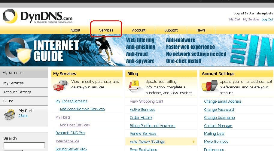 進(jìn)入自己的空間后,要申請(qǐng)自己的免費(fèi)域名,點(diǎn)擊圖中紅色框標(biāo)示處services ,進(jìn)入圖1-4。