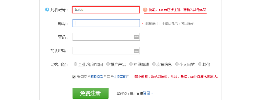 三、查詢自己想要注冊(cè)的網(wǎng)站域名是不是已經(jīng)被注冊(cè),在注冊(cè)頁面的賬號(hào)框中,直接輸入域名的主要部分,例如域名是www.baidu.com ,那baidu 就是域名的主要部分,在輸入了主要部分以后,網(wǎng)站會(huì)自動(dòng)檢測(cè)該免費(fèi)域名是否已經(jīng)被注冊(cè),如果已注冊(cè),則需要更改另外的域名,如果沒注冊(cè),則可以繼續(xù)填寫免費(fèi)域名的注冊(cè)資料,并進(jìn)行確認(rèn):