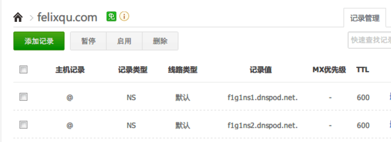 添加好域名后,可以點擊域名進入DNS 解析設(shè)置,這時可以看到DNSPOD 已經(jīng)為這個域名設(shè)置了NS (NameServer )記錄。