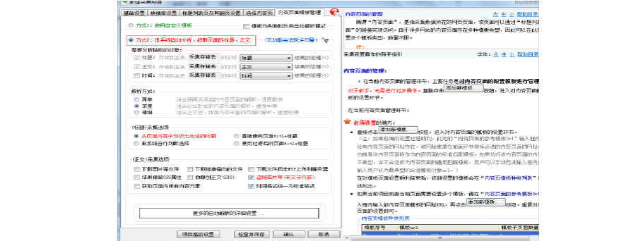 來到內(nèi)容頁面模板管理,這里我會(huì)用到我剛剛說的熊貓正文自動(dòng)解析功能,也就是方式2,由系統(tǒng)為我們自動(dòng)自動(dòng)分離出標(biāo)題和正文,如圖所示: