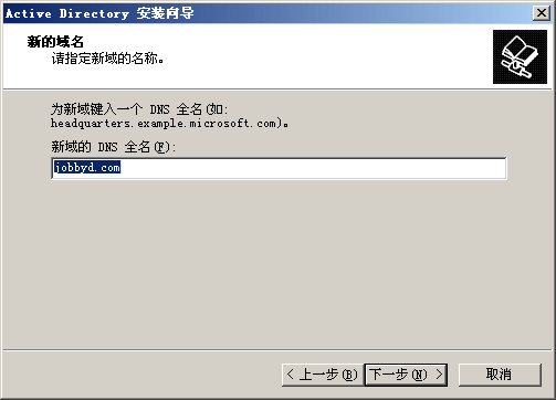 輸入新域的域名(例如“jobbyd.com ”,特別提示,一定要有后綴”.com ”且不能和計(jì)算機(jī)重名)。然后點(diǎn)擊“下一步”,其他頁(yè)面選擇默認(rèn)或自行更改,出現(xiàn)輸入還原密碼頁(yè)面,如下:
