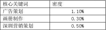 此處因篇幅有限,不逐一對網(wǎng)站中涉及的所有關(guān)鍵詞進(jìn)行分析。結(jié)合公司網(wǎng)站主要業(yè)務(wù),和相對更為精確能帶來轉(zhuǎn)化的三個核心詞,做代表進(jìn)行分析。選取深圳廣告策劃、畫冊制作,深圳營銷策劃三個核心詞,在主頁中的密度。