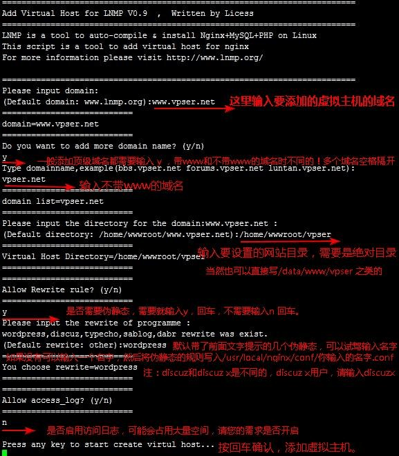 1、添加虛擬主機,執(zhí)行如下命令:/root/vhost.sh 根據(jù)提示輸入要綁定的域名,回車,如果需要添加更多的域名,輸入y ,再輸入要另外綁定的域名,多個域名可以用空格隔開(注:帶www 和不帶www 的是不同的域名,如需帶www 和不帶的www 的域名都訪問同一個網(wǎng)站需要同時都綁定) 。再輸入域名綁定的目錄(絕對目錄,如/home/wwwroot/lnmp,如果不填默認是/home/wwwroot/綁定的域名,目錄不一定非要是/home/wwwroot/,如果/data/ 下面有大量的空間也可以填寫/data/www/lnmp 之類的。) ,再選擇是否添加偽靜態(tài)規(guī)則,默認已經(jīng)有了discuz 、discuzx 、wordpress 、sablog 、emlog 、dabr 、phpwind 、wp2(二級目錄wp 偽靜態(tài)) ,可直接輸入以上名稱即可,如果需要添加自定義偽靜態(tài)規(guī)則,直接輸入一個想要的名字,程序會自動創(chuàng)建偽靜態(tài)文件,直接在/usr/local/nginx/conf/你自定義的偽靜態(tài)名字.conf 里面添加偽靜態(tài)規(guī)則就行(注:添加完執(zhí)行/etc/init.)。接下來會提示是否需要啟用日志功能,