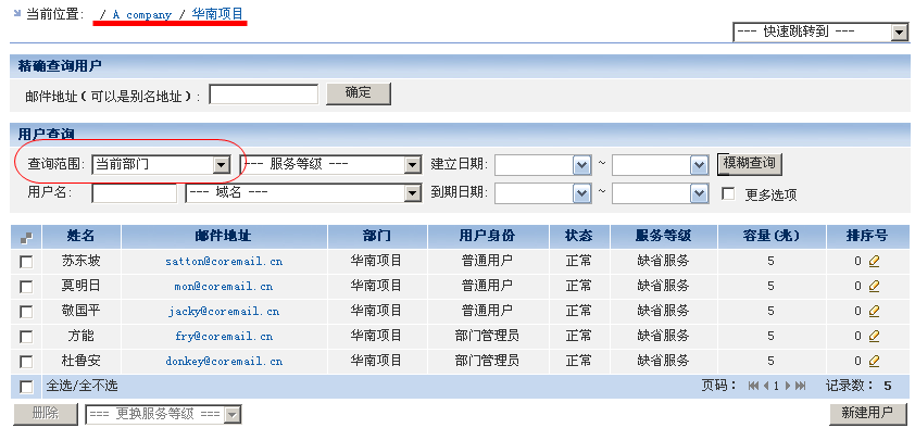 在部門索引頁面,系統(tǒng)提供了針對每個部門的一些操作,從左到右分別為:部門管理員、用戶管理、批量新建用戶以及下屬用戶信件通知。