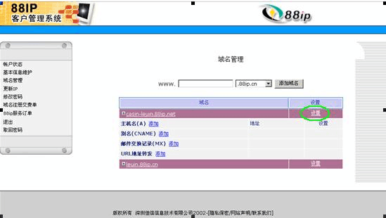 登錄88ip 客戶管理系統(tǒng)http://user.88ip.cn,選取左邊的“域名管理”,然后單擊需設(shè)置域名前面“ ”,展開域名設(shè)置項(xiàng),根據(jù)需求可添加相應(yīng)靜態(tài)ip 域名指向。(默認(rèn)指向當(dāng)前域名所解析的動態(tài)ip) ,如下圖: