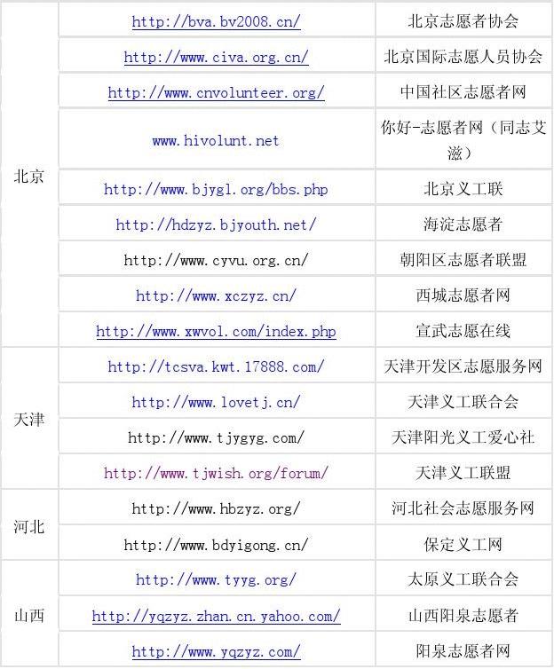 廈門志愿者聯(lián)合網(wǎng): http://www.xmzyz.org/ 龍巖陽(yáng)光志愿者: http://lyleiw.ik8.cn/ 全國(guó)志愿者(義工)組織網(wǎng)站大全之華北篇