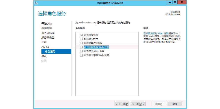 8、添加角色服務(wù),證書頒發(fā)機構(gòu)、證書頒發(fā)機構(gòu)WEB 注冊和證書注冊策略WEB 服務(wù)三項