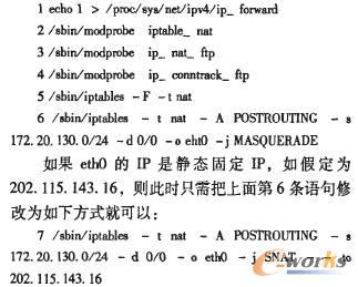 其中語句1:打開口轉(zhuǎn)發(fā)功能,語句2:裝載nat 模塊,語句3和4:保證在應(yīng)用NAT 技術(shù)時ftp 操作的順利進(jìn)行,語句5:清空nat 表中的所有規(guī)則,語句6和7:配置NAT 轉(zhuǎn)發(fā)功能。語句6和語句7的區(qū)別在于一個針對的是動態(tài)IP ,而另一個則是靜態(tài)IP 。每個語句的細(xì)節(jié)限于篇幅在此不作詳細(xì)介紹,有興趣的讀者可以參閱Linux 相關(guān)書籍。 5 結(jié)論
