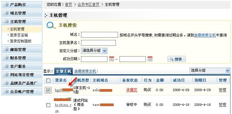 B 、登陸會員后,請您點擊左側(cè)主機(jī)管理: