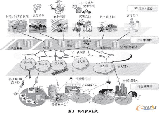 物聯(lián)網(wǎng)的感知環(huán)節(jié)具有很強的異構(gòu)性,為實現(xiàn)異構(gòu)信息之間的互聯(lián)、互通與互操作,未來的物聯(lián)網(wǎng)需要以一個開放的、分層的、可擴展的網(wǎng)絡體系結(jié)構(gòu)為框架.目前,國內(nèi)的研究人員在描述物聯(lián)網(wǎng)的體系框架時,多采用ITU-T 在Y.2002建議中描述的USN 高層架構(gòu)(如下圖所示) 作為基礎(chǔ),自下而上分為底層傳感器網(wǎng)絡、泛在傳感器網(wǎng)絡接入網(wǎng)絡、泛在傳感器網(wǎng)絡基礎(chǔ)骨干網(wǎng)絡、泛在傳感器網(wǎng)絡中間件、泛在傳感器網(wǎng)絡應用平臺5個層次.