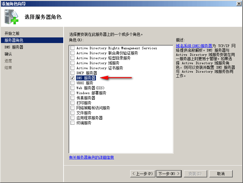 1.2在“選擇服務(wù)器角色”窗口中,選擇“DNS 服務(wù)器”