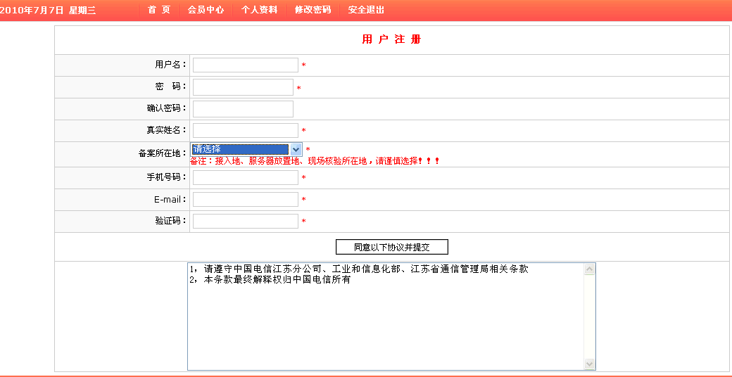 2)點(diǎn)擊首頁(yè)的“注冊(cè)”按鈕,注冊(cè)<<江蘇電信網(wǎng)站備案管理系統(tǒng)>>登錄賬號(hào),標(biāo)注*為必填項(xiàng)。如圖所示: