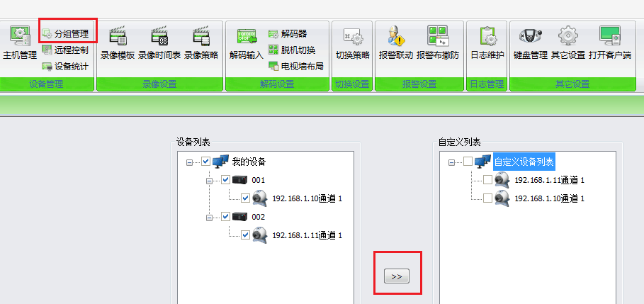 3、 進入分組管理把攝像機添加到列表中,如下圖。