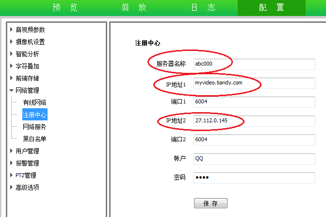 設置,服務器名稱為注冊的域名,IP 地址1、IP 地址2分別設置myvideo.tiandy.com 、27.112.0.145;賬戶:QQ ,密碼:QQQQ 。