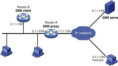 z Router B作為DNS 客戶端,指定域名服務(wù)器為Router A。 Router A作為DNS 代理。實(shí)際域名服務(wù)器的IP 地址為4.1.1.1。 Router B通過DNS 代理Router A實(shí)現(xiàn)域名解析。
