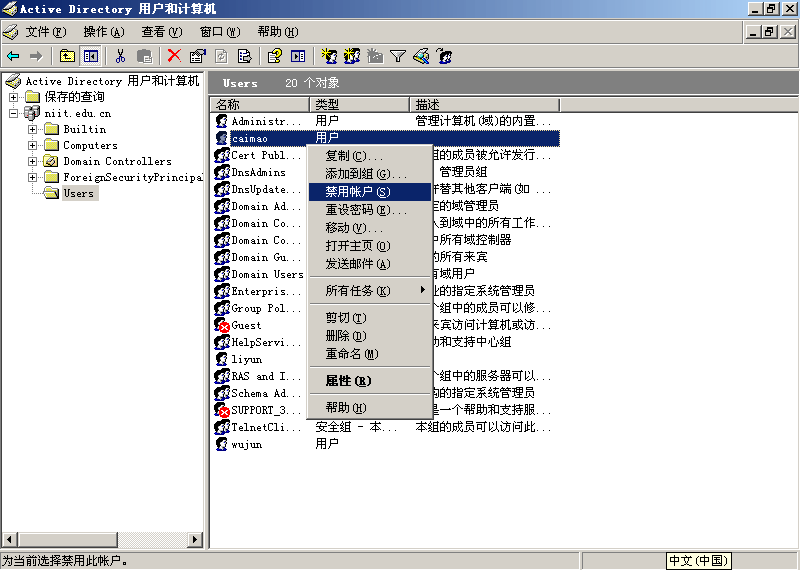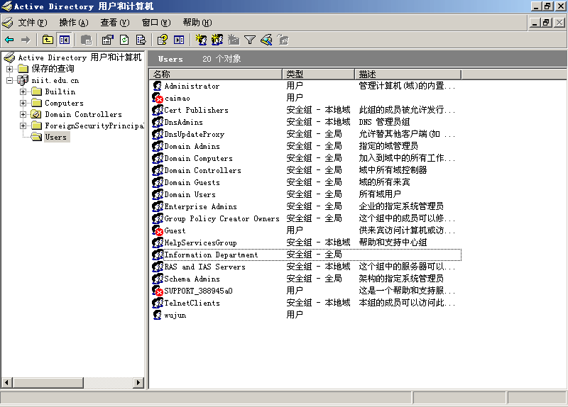 (1)【開始】→【管理工具】→【Active Directory 用戶和計算機】→【Users 】,如圖8-19所示。