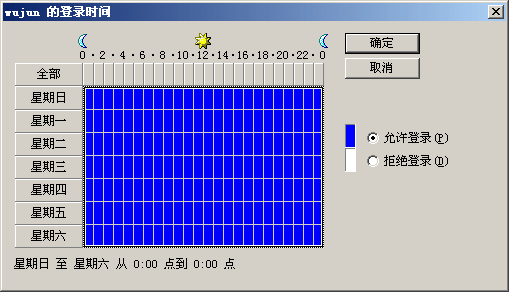 (3)單擊【登錄時間】,彈出wujun 登錄時間對話框,如圖8-9所示。設(shè)置登陸時間后,結(jié)果如圖8-10所示。單擊【確定】返回圖8-8。