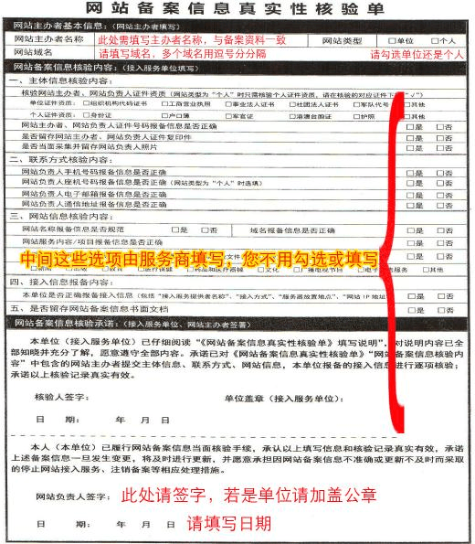 4. 若是單位,除在“網(wǎng)站負責人簽字”處簽名外,還需要加蓋單位公章 您只需要填寫核驗單上(網(wǎng)站主辦者名稱,網(wǎng)站類型,網(wǎng)站域名以及網(wǎng)站負責人簽字)幾處即可,其它的均可不用填寫。如下圖示例:
