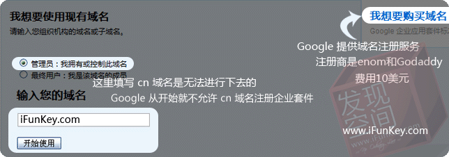 三、輸入打算開通 Google 域名郵箱也就是企業(yè)套件的域名,注意,Google 從一開始就不允許cn 域名注冊(cè)企業(yè)套件,后來(lái)有個(gè)小寫改大寫蒙混過(guò)關(guān)的漏洞也在2009年的2月被 Google 堵上了,換句話說(shuō),cn 域名截止到目前是無(wú)法成功注冊(cè) Google 的企業(yè)套件的。如果沒(méi)有域名 Google 也提供注冊(cè),注冊(cè)商可選 enom 和 godaddy 兩家, ,價(jià)格為10美元。