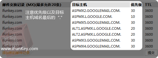 以下就是域名MX 記錄中要填寫的服務(wù)器地址,1,5,10這幾個(gè)數(shù)字指的是優(yōu)先級(jí),有的域名商可能不是這幾個(gè)數(shù)字,但只要保證優(yōu)先級(jí)一致即可;TTL 為3600秒,有的是one hour~