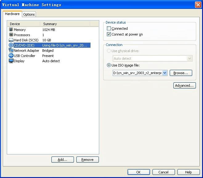 ,1、首先開(kāi)啟虛擬機(jī),使用ISO 鏡像文件位置指向Windows Server 2003 Enterprise Edition ISO文件。