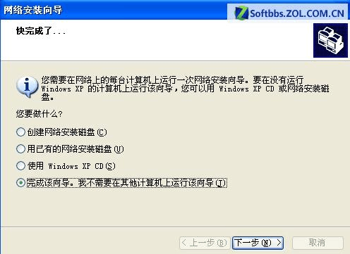 再下一步設(shè)置計算機名和計算機描述隨便填,但不要和主機一樣,然后是工作組,一定要填和主機一樣的,如默認的MSHOME 。以后一直默認,直到最后一項" 完成改向?qū)?。我不需要在其它計算機運行該向?qū)? 。