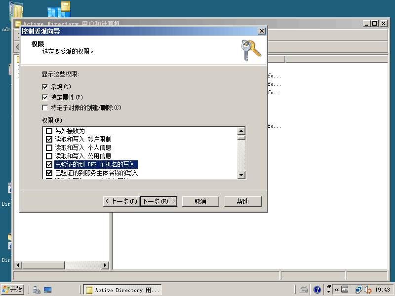 如上圖所示,在權(quán)限中拉動(dòng)滾動(dòng)條,依次選擇“讀取,寫(xiě)入,讀取和寫(xiě)入帳戶限制,已驗(yàn)證的到DNS 主機(jī)名的寫(xiě)入,已驗(yàn)證的到服務(wù)主體名稱的寫(xiě)入”。點(diǎn)擊“下一步”