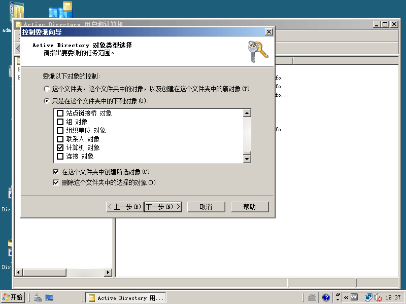 選擇“只是在這個(gè)文件夾中的下列對(duì)象”,下拉滾動(dòng)條選擇“計(jì)算機(jī) 對(duì)象”,并選擇“在這個(gè)文件夾中創(chuàng)建所選擇對(duì)象”和“刪除這個(gè)文件夾中的選擇的對(duì)象”,之后點(diǎn)擊“下一步”