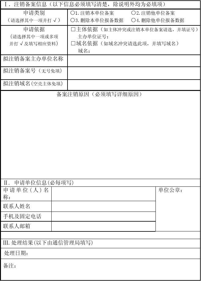 4.Ⅰ、Ⅱ部分由申請人填寫,除非另有說明,否則每項為必填項。第Ⅰ部分前三項為擬注銷并已存在系統(tǒng)的備案信息,非指申請人未提交的信息;無備案號備案即未通過審核備案,只適用刪除備案信息;空殼主體指只含主體部分信息,不含網(wǎng)站信息(域名)的備案信息,只適用于主體沖突。