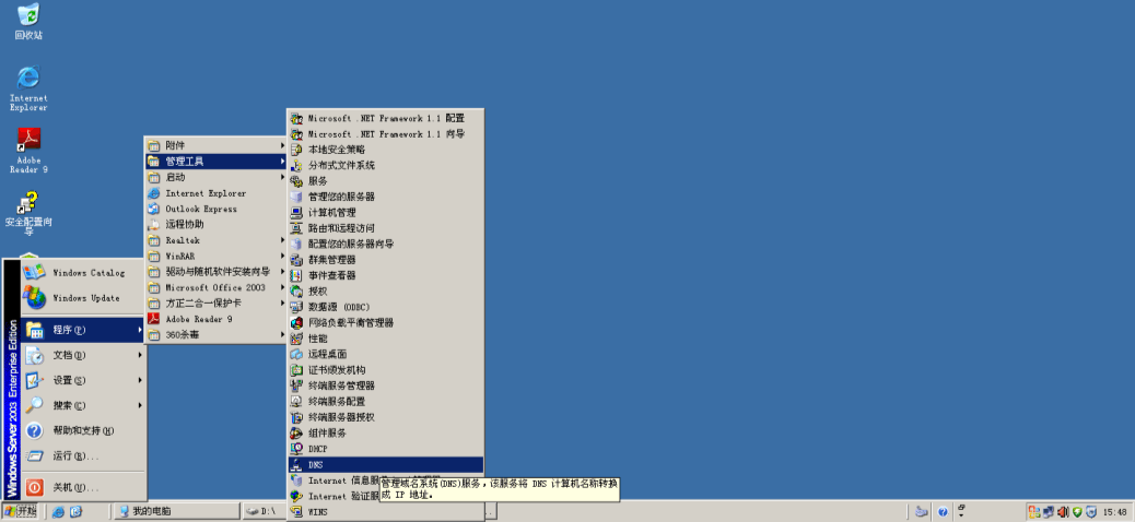 ,驗證:安裝完畢后在管理工具中多了一個 “D N S ”控制臺。在“開始→程序→管理工具”中可以看到并使用相關服務。