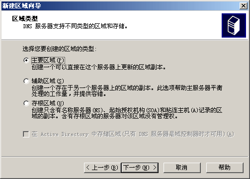 在 DNS 控制臺左側窗體中選擇服務器,單擊“操作”菜單,選擇“新建區(qū)域”,啟動“新建區(qū)域向?qū)А保?在對話框中,區(qū)域類型選擇“主要區(qū)域”,單擊下一步,如下圖 ;