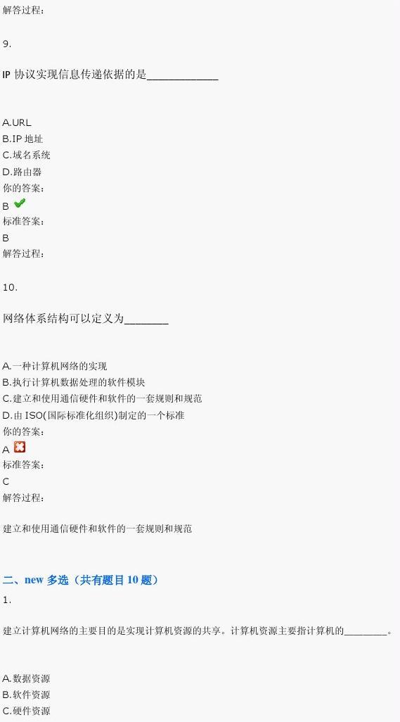 一、new 單選(共有題目10題) 1.網(wǎng)絡協(xié)議主要要素為__________A. 數(shù)據(jù)格式、編碼、信號電平B. 數(shù)據(jù)格式、控制信息、速度匹配C. 語法、語義、同步D. 編碼、控制信息、同步你的答案