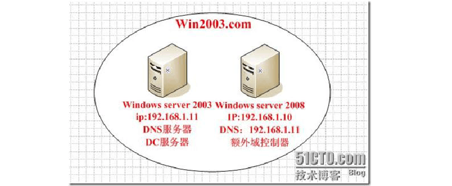 好了,不多說了,現(xiàn)在我們就開始做吧!有兩臺計算機一臺計算機的操作系統(tǒng)是windows server 2003操作系統(tǒng),另一臺是windows server 2008操作系統(tǒng)。windows server 2003是DC 、DNS 服務器,IP :192.168.1.11 ,域名win2003.com ;windows server 2008是