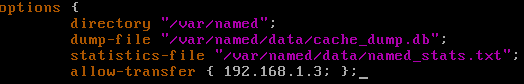●在192.168.1.2主DNS 服務(wù)器上,編輯/etc/named.conf文件的options 選項(xiàng),設(shè)置允許進(jìn)行區(qū)域傳輸。