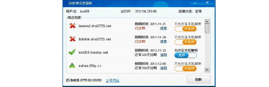 刷新:刷新域名解析狀態(tài)(出口IP 、域名信息),此操作將使域名解析客戶端重新登錄服務(wù)器;