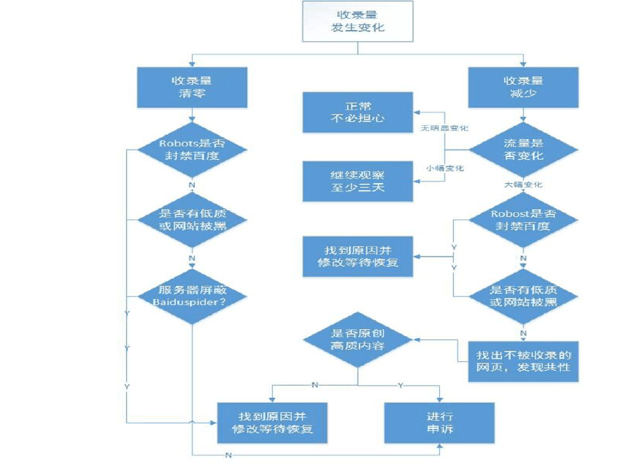 流量的基石,盯著百度站長平臺提供的索引量工具查看數(shù)據(jù)應(yīng)該是很多站長每天的例行工作。理論上說,索引量發(fā)生波動屬于正常,但也不應(yīng)掉以輕心。可以通過以下流程圖來進(jìn)行問題排查。